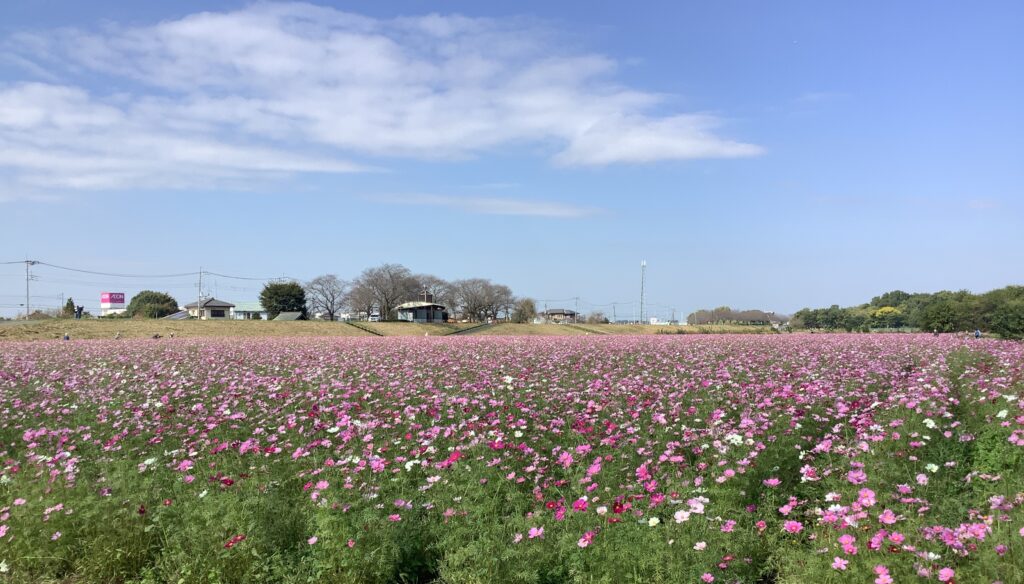 小貝川の橋の下にコスモスが綺麗に咲き出しました🌼天気の良い日を見計らい、ドライブに出かけました🚙
